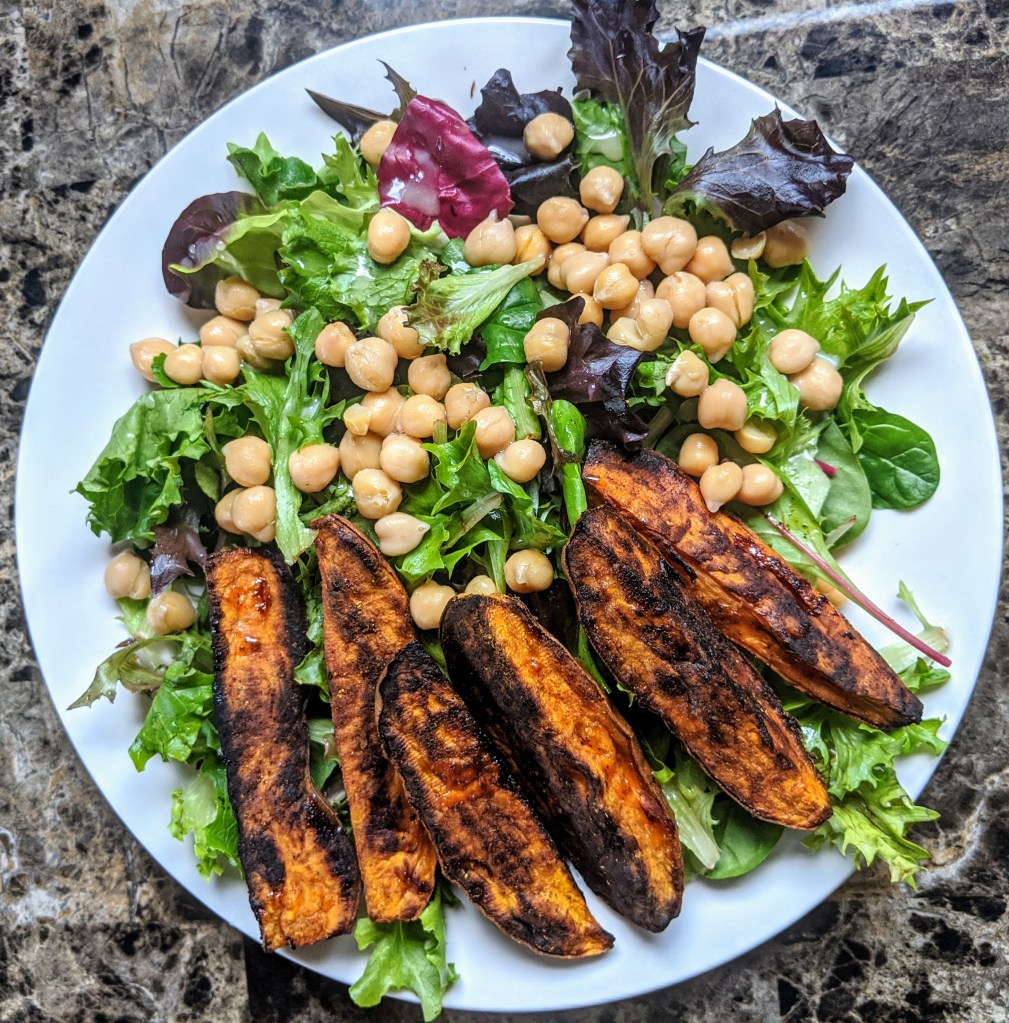 In addition, I am a big advocate for meal prepping or batch cooking. Taking a little time on one day to bake oatmeal for breakfasts, make a chickpea salad for lunches, and cut up vegetables for snacks makes every other day a grab-and-go scenario. When I take the time to cook a more complex dinner, I make sure there is enough for more than one meal, either later that week or to be frozen.