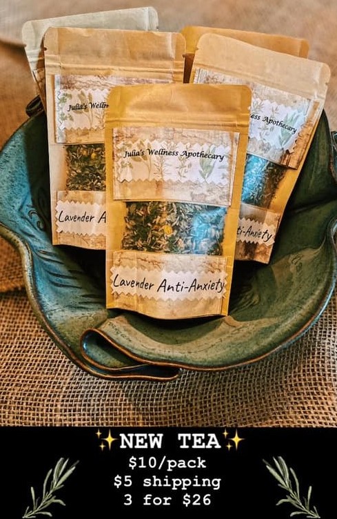 If you like to support small businesses, my herbal loose leaf teas, Julia’s Wellness Apothecary, are available! I offer Immune Support, Oat Chai, Calm Spirit, Lavender Anti-Anxiety, Rose Beauty, Gut Health, and Anti-Inflammatory blends. If there’s a more specific issue you have in mind, I’d happily make you a custom blend.